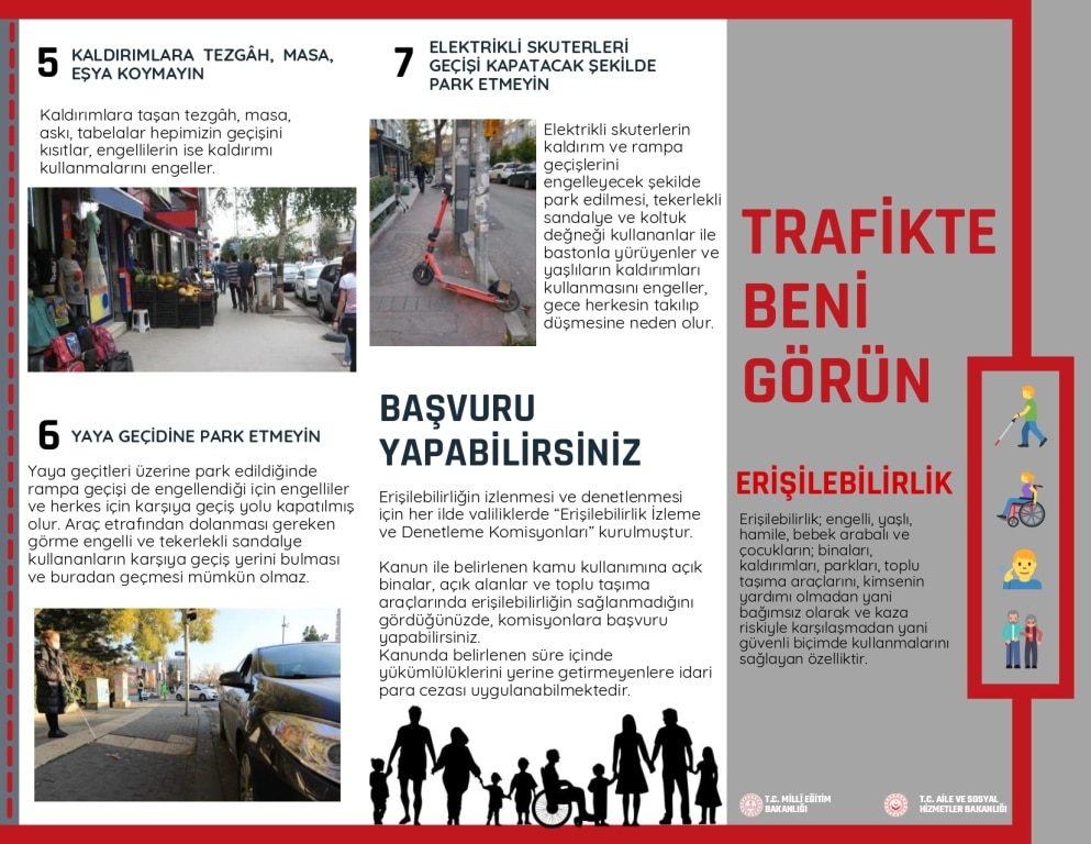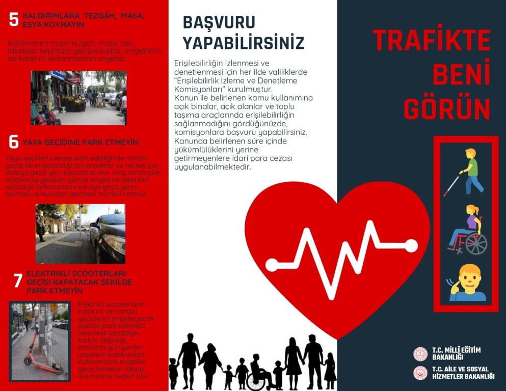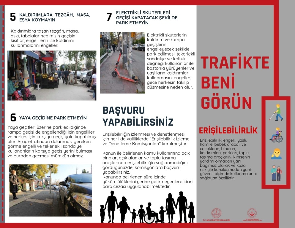 Özel Öğretim Kurumları Genel Müdürlüğünün, Karayolu Trafik Güvenliği Eylem Planı (P.G7.13.1) kapsamında, "Engelli ve yaşlı bireylerin trafik güvenliğinin sağlanması konusunda toplumun diğer kesimlerinde farkındalığın artırılması"nıa yönelik "TRAFİKTE BENİ GÖRÜN" başlıklı broşürü yayınladı.